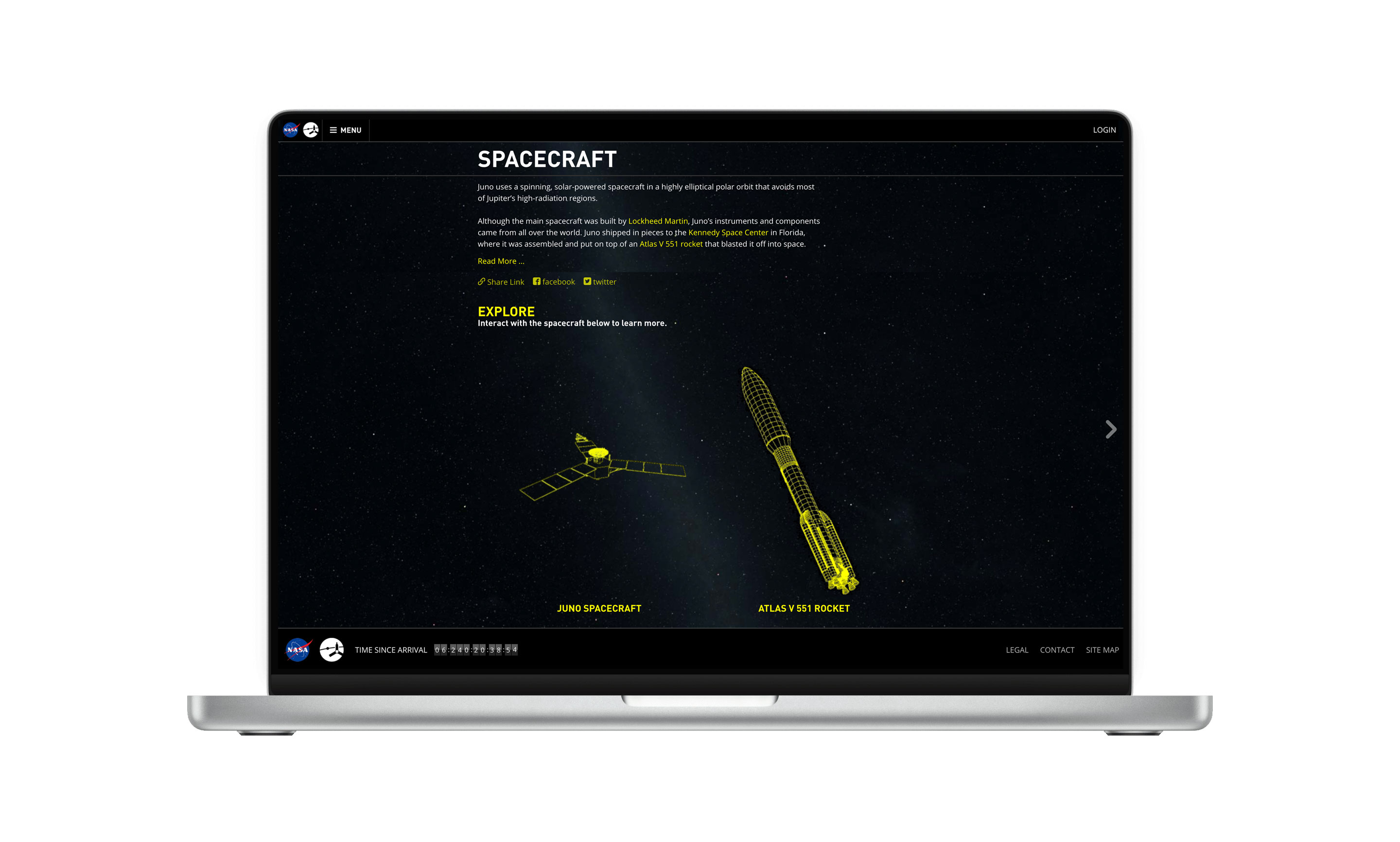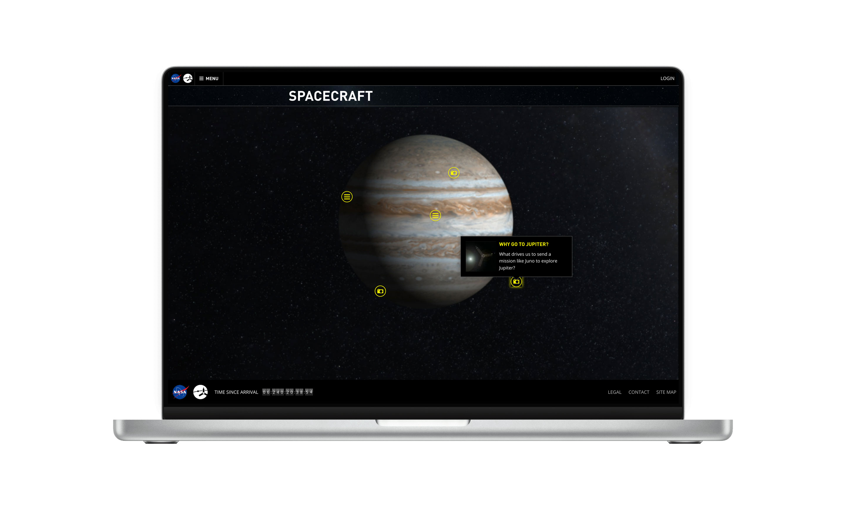 Mission Juno is an interactive digital documentary designed to change the way the public perceives space exploration. Translating complex scientific data into a clear and compelling narrative of space exploration, the Mission Juno website engages visitors in a cinematic experience that allows them to track, learn about, and explore NASA’s mission to Jupiter.